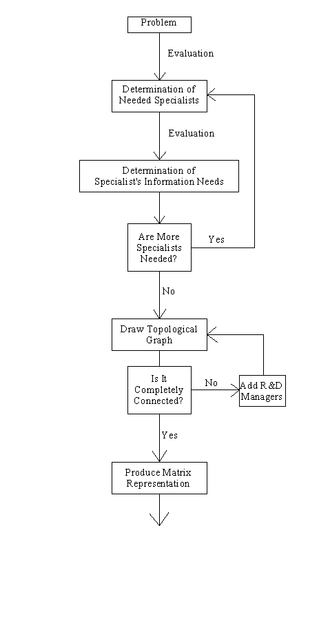 This is the most crucial thrust of this thesis. The research organization must be designed in a manner which will promote effective communication based on the information needs of the specialists involved. The system method has been chosen to initially design the research organization as has been shown in chapters five through nine. Figures X-1 through X-4 are flowchart simplifications of the four basic steps originally presented in chapter V. Figure X-5 presents a further simplification and overall view of the entire systems model for the initial organization of transdisciplinary research.
